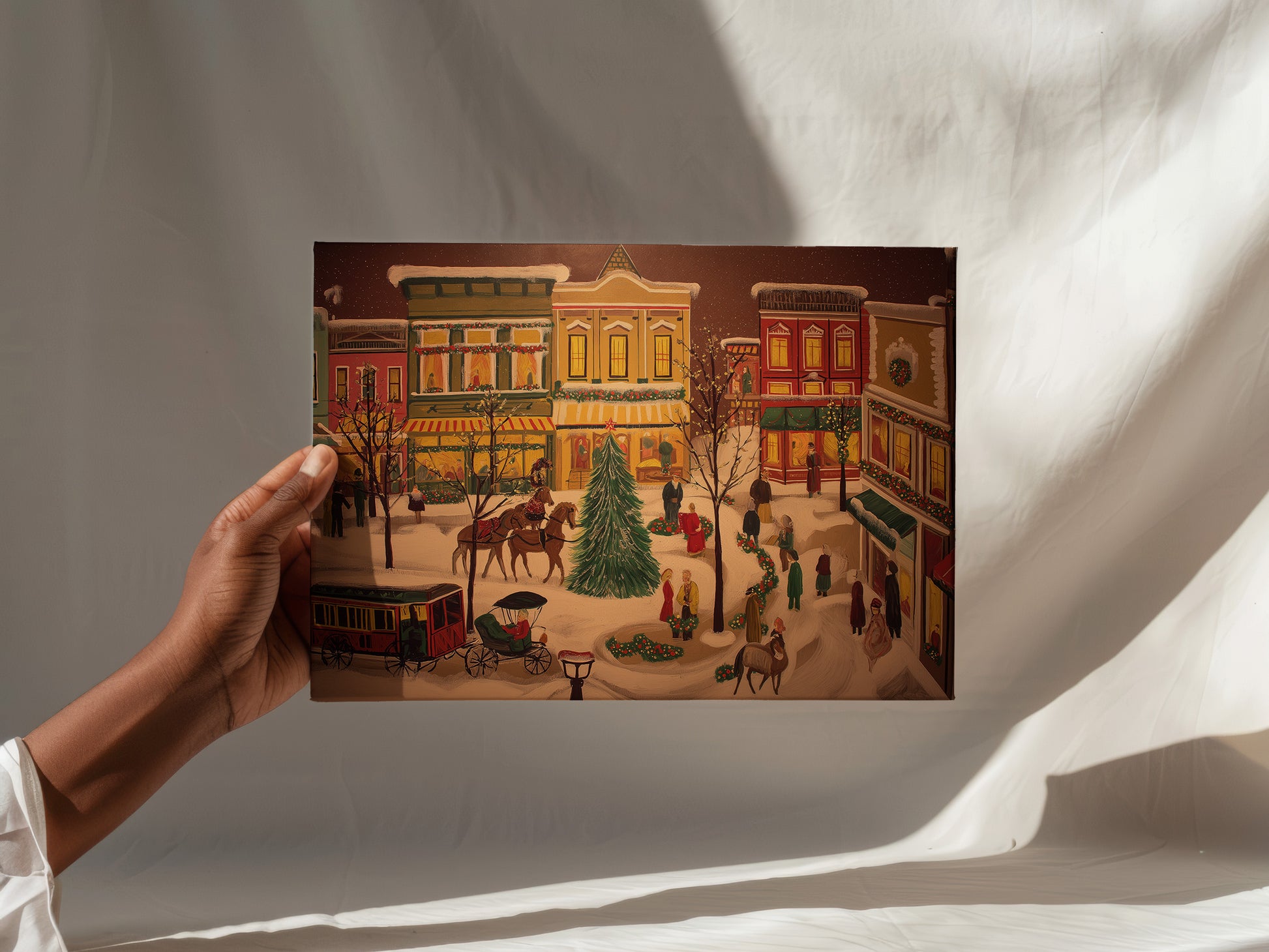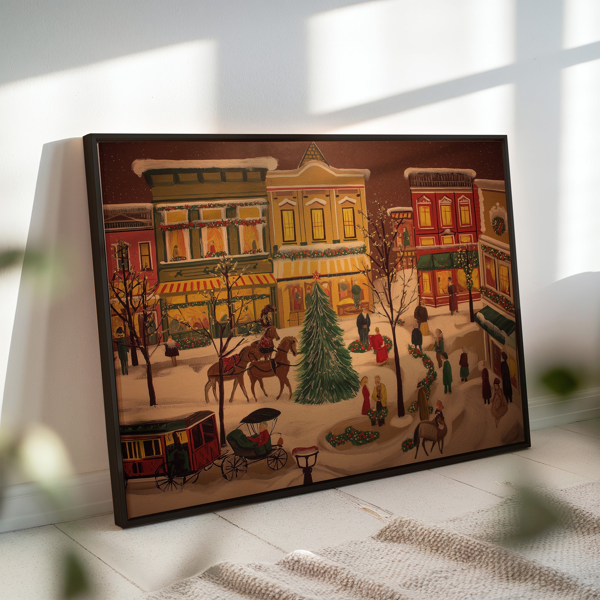 Western Town Christmas Canvas Print: Folk Art Victorian Street Scene